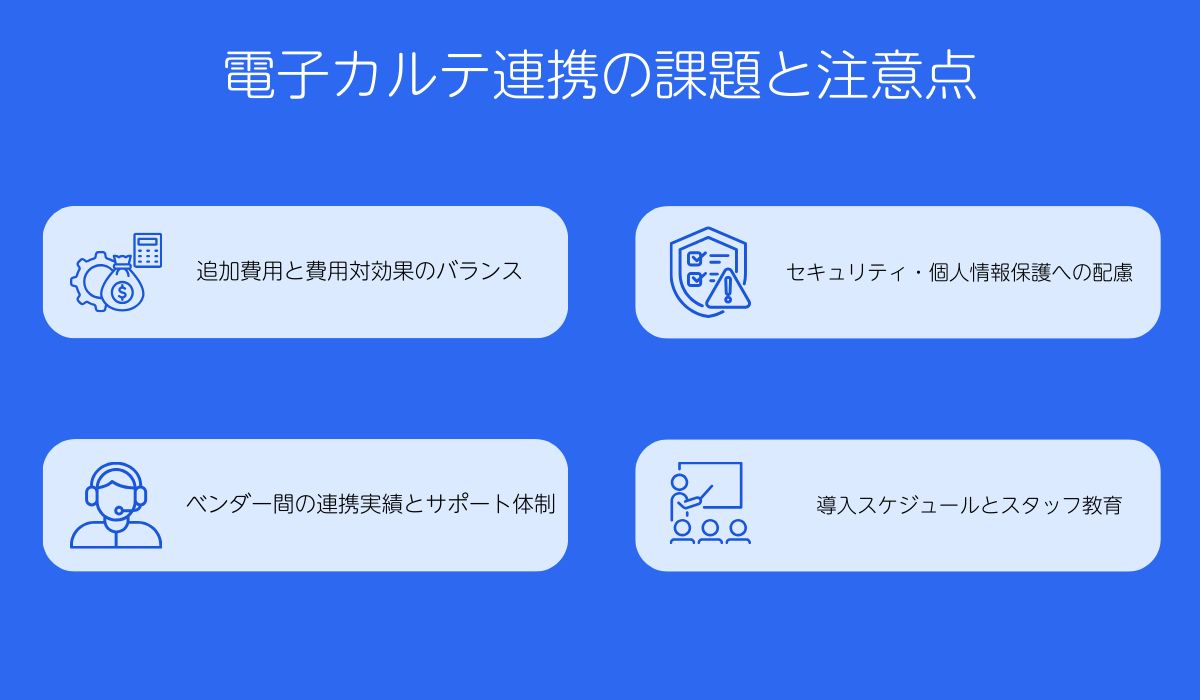 電子カルテ連携にはさまざまなメリットがありますが、一方で、課題と注意点もあります。どのような課題が生じうるのかを理解した上で電子カルテを選定し、連携の優先順位を検討することが大切です。
