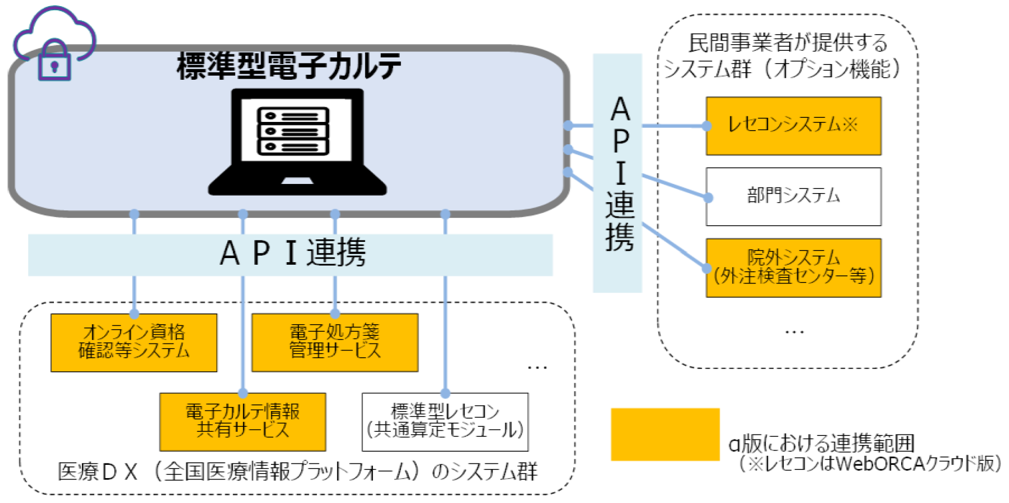 令和6年度末以降、電子カルテ未導入の医科無床診療所を対象に、「標準型電子カルテα版」のモデル事業が順次実施されてきました。α版に実装されているのは必要最小限度の機能であり、その連携範囲は以下の通りです。※4、5