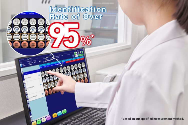 The imprints and characters on the packaged tablets are accurately recognized and neatly arranged for display. Color-coding is used to indicate any medication mismatches.